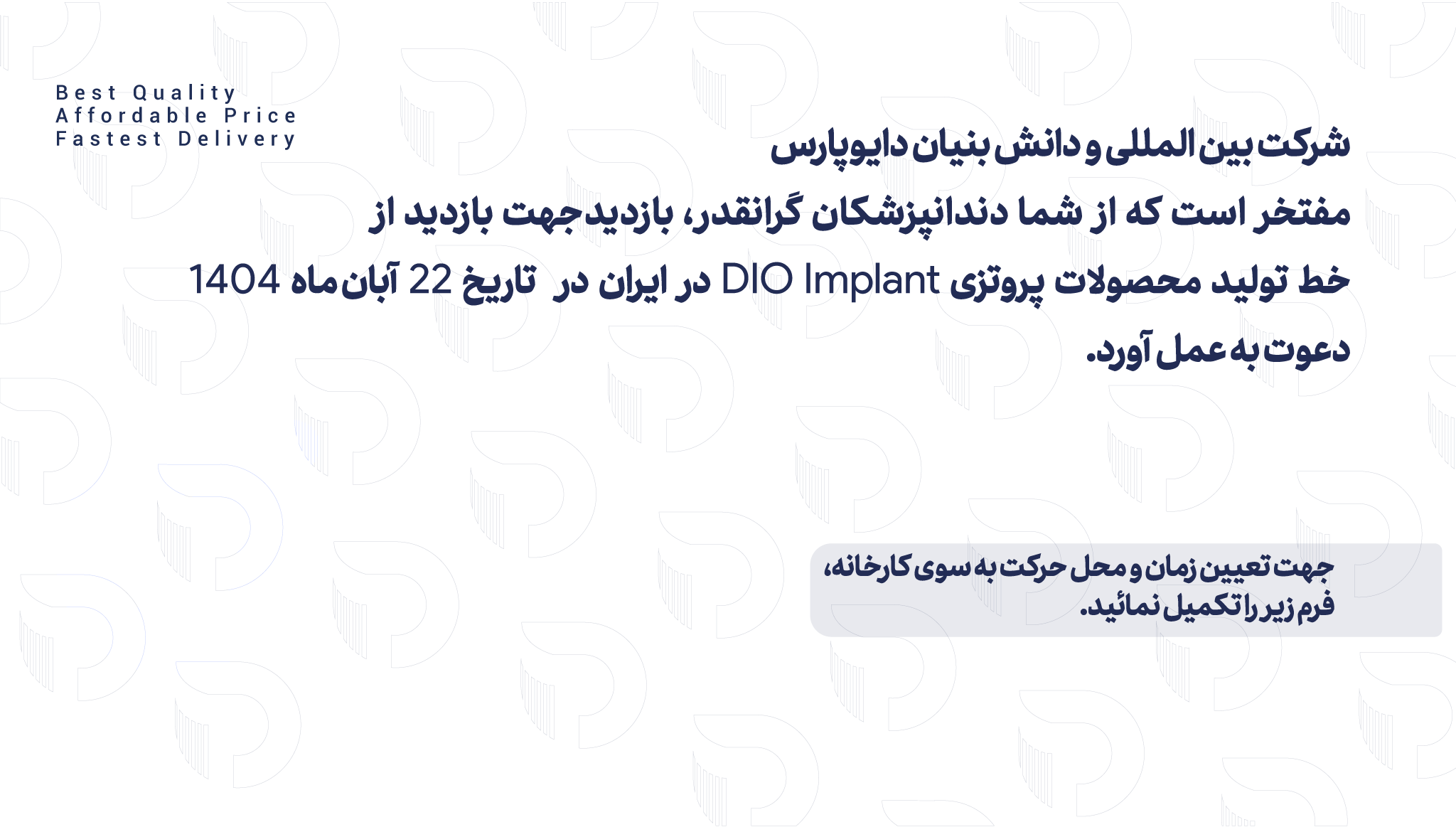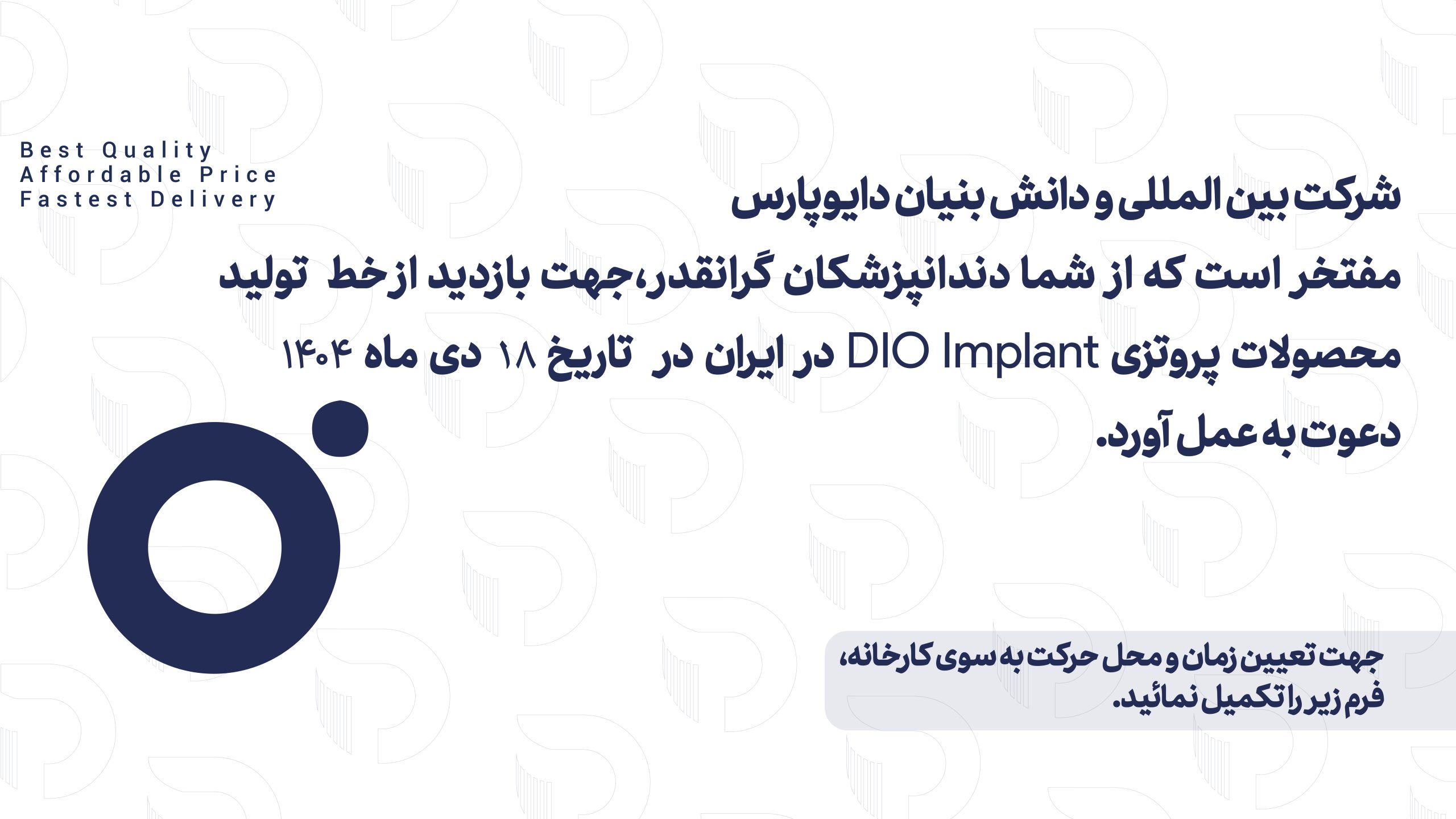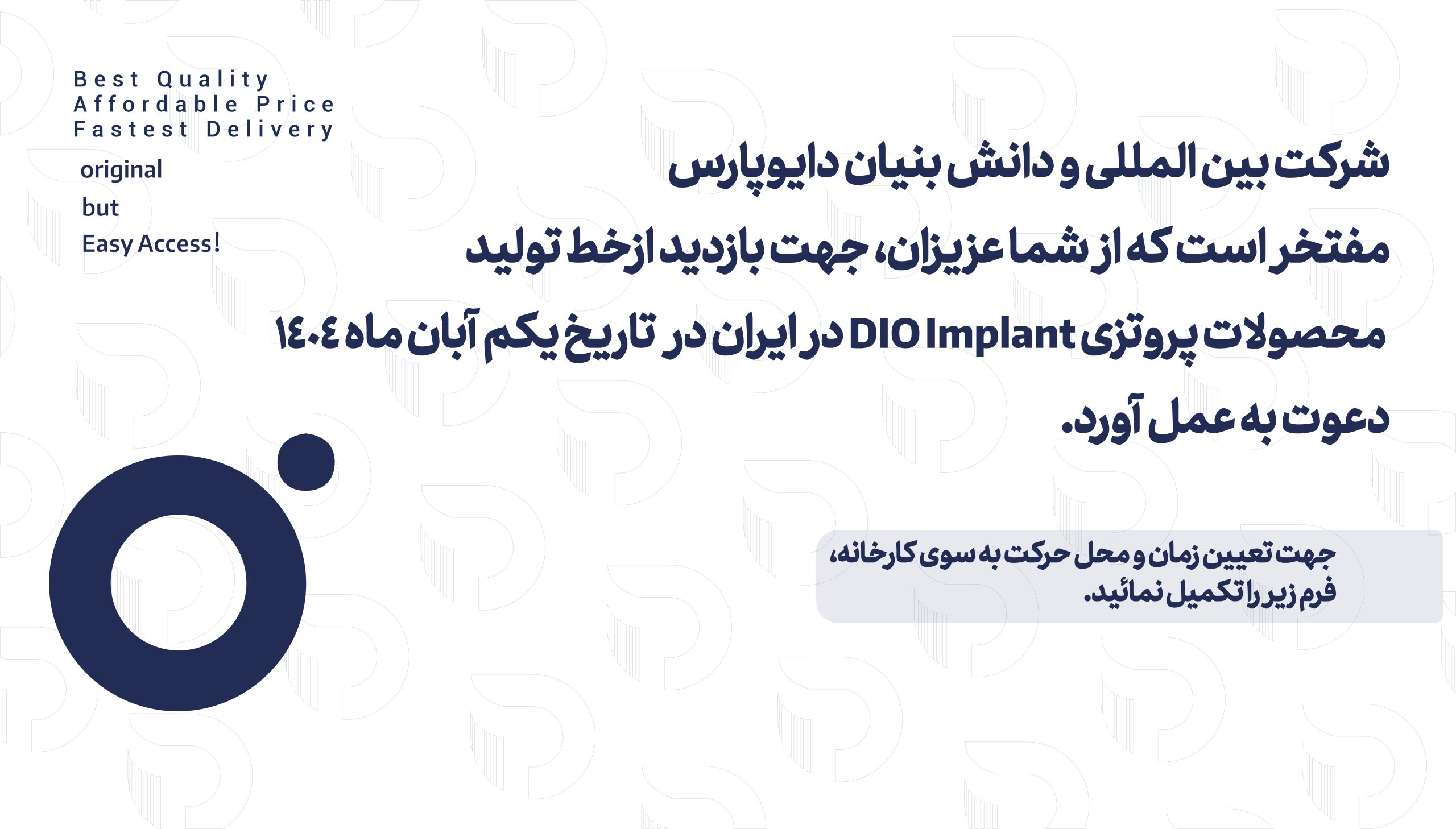جهت هماهنگی تاریخ و زمان بازدید از کارخانه Dio Implant کارشناسان دایوپارس با شما تماس خواهند گرفت.